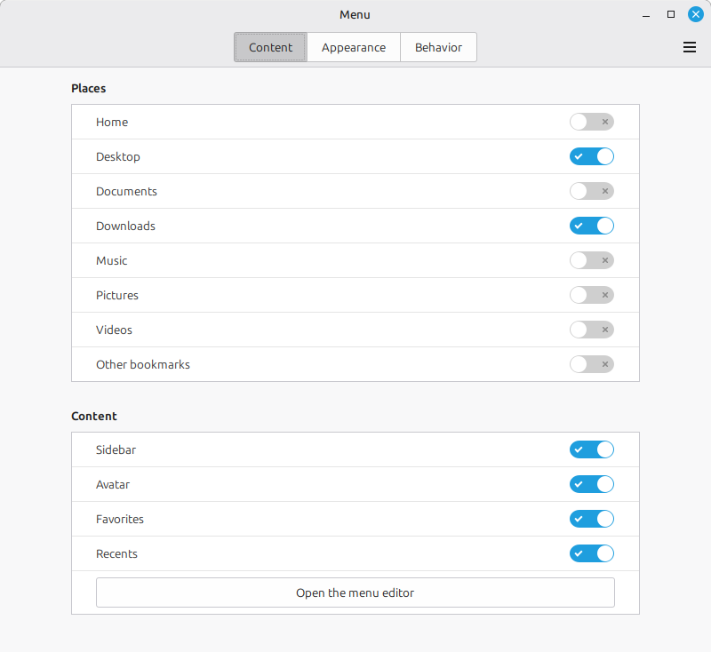 In the preferences it is possible to hide some of the elements to make the menu smaller or to dedicate the sidebar to only show places, bookmarks or favorite apps.